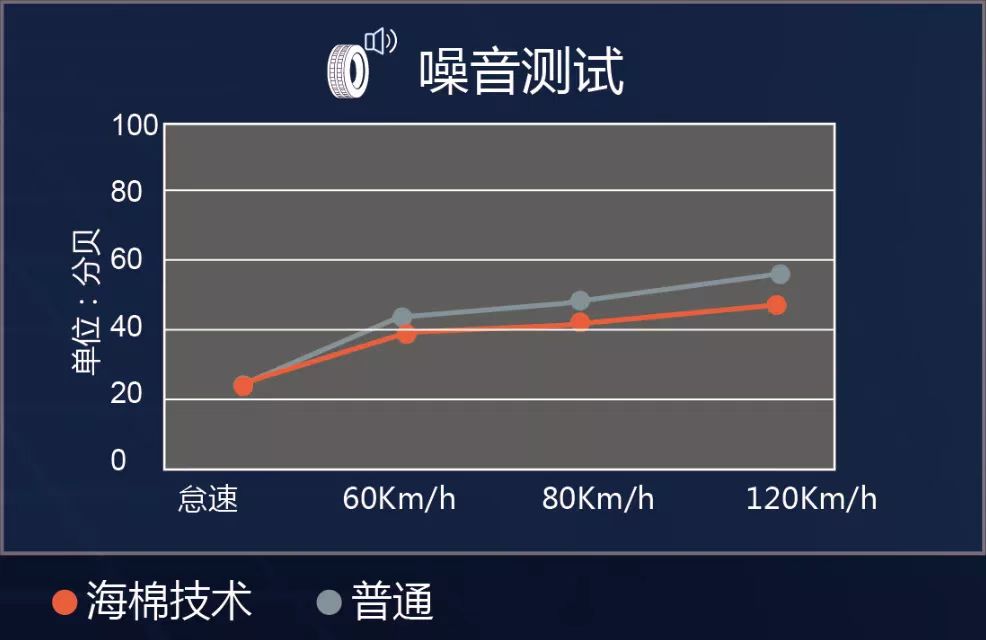 與同一產品普通輪胎相比,運用吸音海綿技術的輪胎,依照寸別不同,分別可降低噪音5-10dB,輪胎尺寸越大,降噪感覺越明顯。
