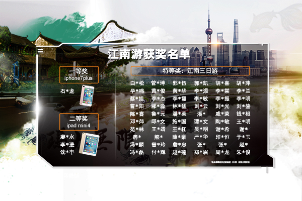 截止9月30日,瑪吉斯輪胎為消費者量身定制此次“江南游”活動也迎來了尾聲,經后臺統計共計3455人參加,其中有效參與達2000余人。十一黃金周過后,工作人員也于系統后臺公平公正抽選出特等獎60名、一等獎1名、二等獎3名及幸運獎100名,現公布獲獎名單如下: